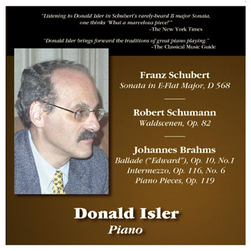 KASP 57651— Works by Schubert, Schumann, & Brahms $ 9 plus shipping (CD) Click here to BUY from the KASP website The American Record Guide called this "an outstanding release." It includes two of the less frequently heard masterworks of Schubert and Schumann, plus six great short works of Brahms. The E-Flat Major Sonata of Schubert is a truly outstanding work, especially for a twenty year old composer. The outer movements have great charm and harmonic ingenuity, and the slow movement shows surprising passion, and depth. Schumann's Waldscenen (Forest Scenes) are a collection of nine short pieces displaying a remarkable contrast of moods and feelings. Though the "Prophet Bird" is probably the most famous of them, the listener will surely also enjoy the "Haunted Place," the exuberant "Friendly Landscape," the repose of "Shelter," the "Hunting Song," and the other three pieces which make Waldscenen the epitome of the miniature as art form. The Brahms works include the early "Edward Ballade," based on a tragic Scottish ballad, a wonderful autumnal Intermezzo from his Op. 116, and the Four Piano Pieces of Op.119, Brahms's last work for solo piano. This last wonderful group runs the emotional gamut from the profound first Intermezzo, to the edgy yet charming second, to the rambunctious third, and finally to the sometimes ominous, yet triumphant concluding Rhapsody. Donald Isler has been praised by the New